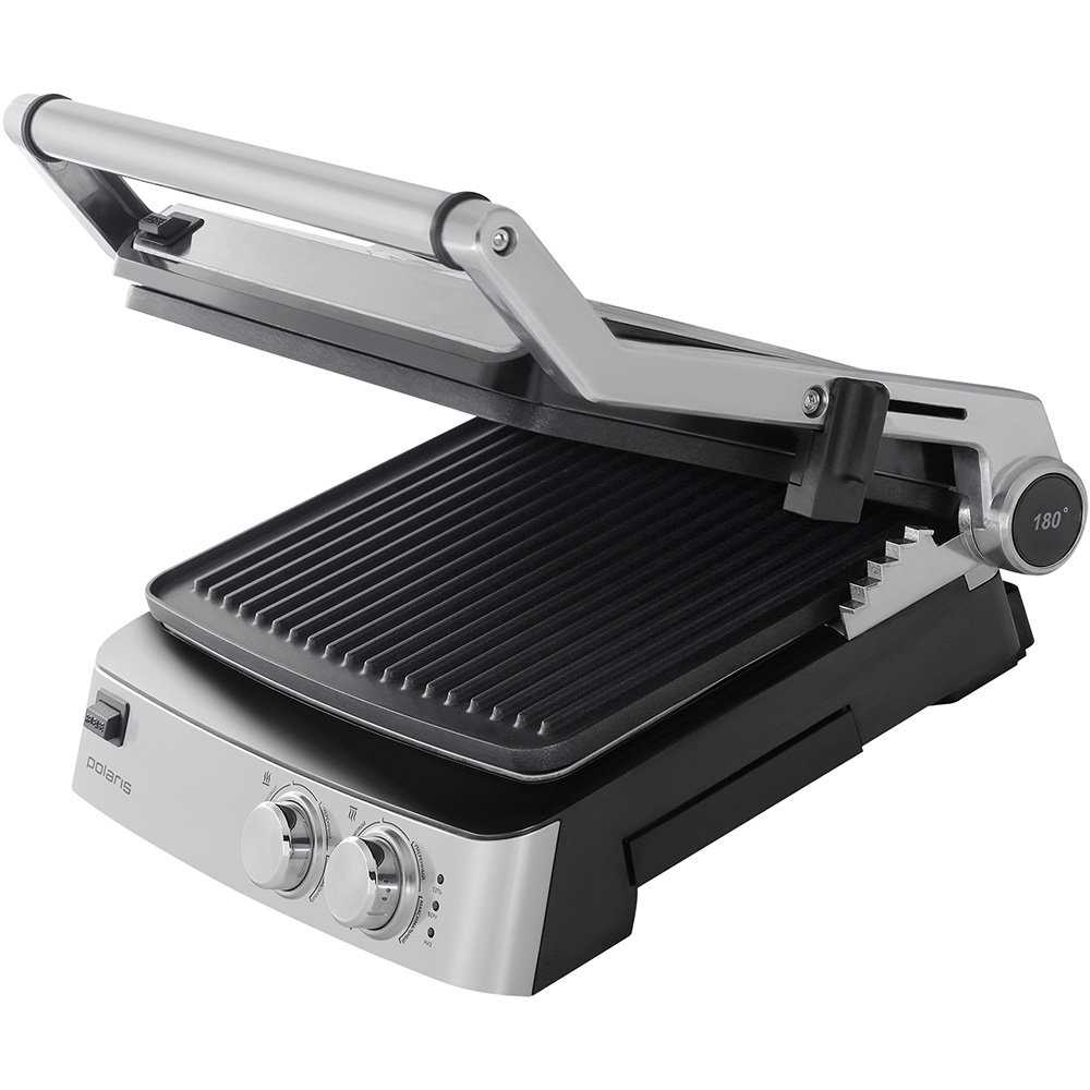 Эти модели похожи на вафельницы: поверхности прижимают продукт с двух сторон. Они отлично справляются с тостами, оладьями, стейками и омлетами, придают еде привлекательный внешний вид благодаря рифлёным плоскостям. На них также удобно разогревать готовые блюда. Они компактные, легко моются, и их удобно хранить. Про лучшие грили электрические такого типа читайте в нашем обзоре ниже.