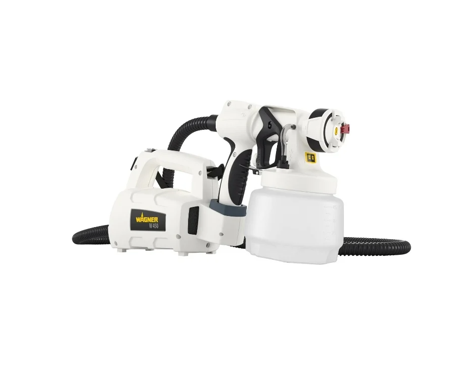 Этот электрический краскораспылитель от WAGNER работает по технологии HVLP. У него небольшой пистолет с емкостью для материала в нижней части, который связан с электрической насосной станцией шлангом. Общий вес комплекта составляет 2 кг. Оператор носит насос за ручку в одной руке, а второй удерживает краскопульт. Максимальная производительность составляет здесь 230 мл за минуту, но расход материала можно уменьшить, чтобы производить окрашивание тонким слоем. Мощность оборудования составляет 460 Вт. Средняя скорость работы обеспечивает производительность до 1.5 м² за минуту. В отзывах электрическая модель нравится покупателям качественной сборкой и выносливостью.