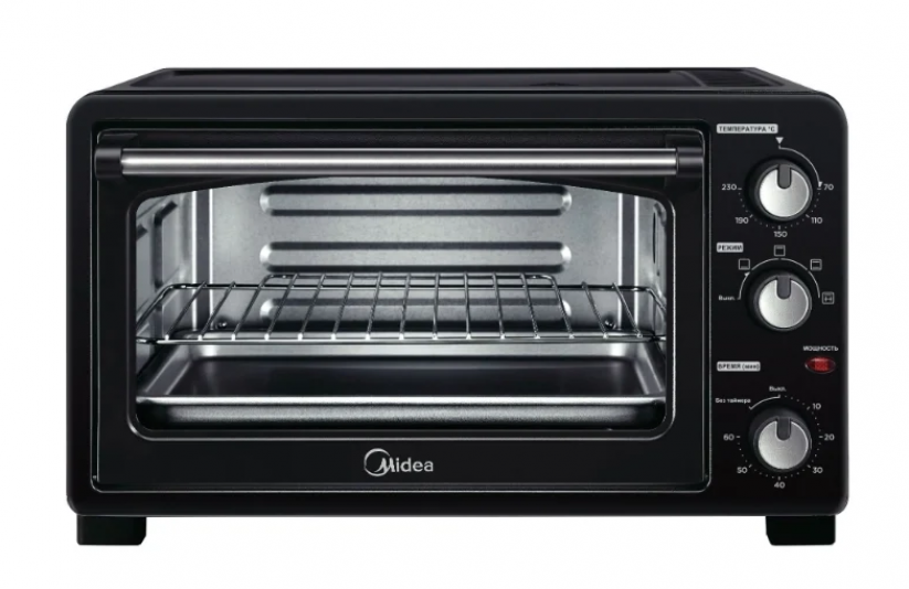 А закроет категорию лучшая недорогая модель мини-печи, которую производит компания Midea. Без сомнения, её можно назвать самой качественной среди бюджетных решений. Здесь установлено три поворотных регулятора, вокруг которых имеется чёткая разметка температуры, режимов и времени работы. Максимальное время таймера для MO-2501 равняется 60 минутам, но печь можно включить и на непрерывную работу.
