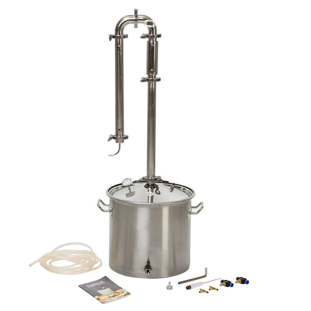 Данная конструкция позволяет получить качественный продукт двойной перегонки за короткое время. Конструкция дистиллятора включает основной бак объемом 20 л., внутренний стакан, двухконтурный охладитель, разборный сухопарник. Последний применяется для дополнительной очистки и ароматизации спирта-сырца. Производитель предусмотрел наличие крана отбора голов и хвостов, что позволит легко отобрать необходимое число голов с первого перегона, отсекая при этом хвосты. Дополнительный комфорт и более широкие возможности использования дают наличие двух электронных термометров, плоское дно, сухопарник, оснащенный сливным краном.