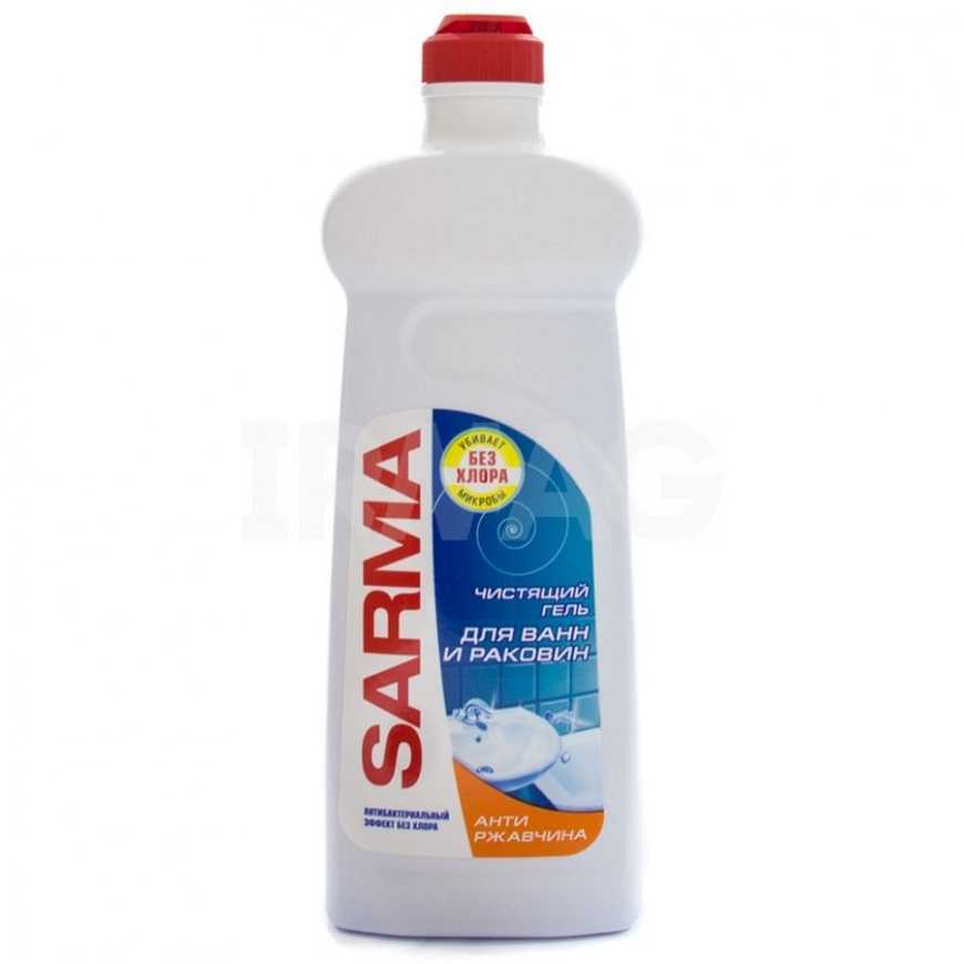 В составе отсутствует хлор и агрессивные кислоты. Sarma гель чистящий для ванн и раковин Универсал эффективен в отношении ржавчины, известкового налета и неприятного запаха, обладает антибактериальным эффектом. Основа формулы представлена НПАВ. Цена – 90 рублей.