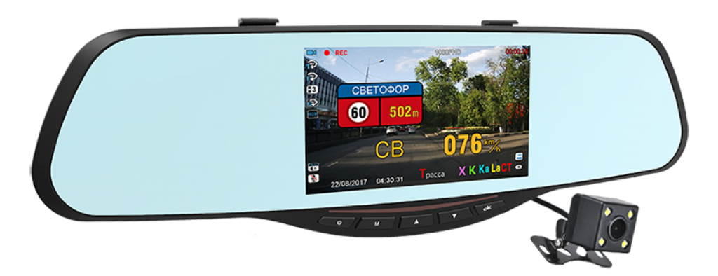 Топ-модель среди антирадарных видеорегистраторов с двумя камерами, позволяющая подключить дополнительные записывающие устройства. Внешне имитирует салонное зеркало для заднего обзора. Девайс имеет 16 Гб встроенной памяти, чего с лихвой хватает для циклической записи длительных поездок. Эргономичный экран на 5 дюймов позволяет с легкостью настраивать гаджет. Full HD видео, снятое с обзором в 175 градусов, можно просматривать мгновенно, сохранять отдельные важные фрагменты. Устройство имеет 4 датчика парковки, которые значительно облегчают вождение новичков. Антирадарный блок чутко реагирует на системы контроля со стороны полиции, вовремя подсказывая их месторасположение.