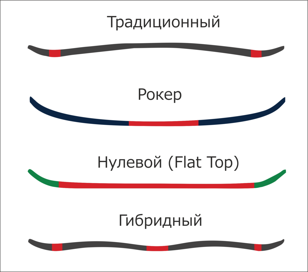 - Традиционный прогиб (Camber) – при нагрузке распрямляется, но при отрыве от поверхности возвращается в свою форму. Обеспечивает стабильную управляемость.