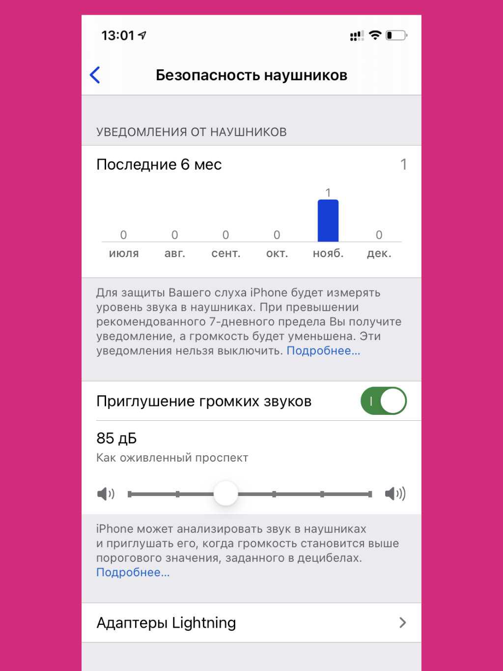 Во-первых, он показывает уведомления о чрезмерно завышенной громкости. Во-вторых, дает возможность приглушать громкие звуки не выше определенного уровня (по умолчанию используется значение 85 дБ). В общем, уши скажут спасибо.