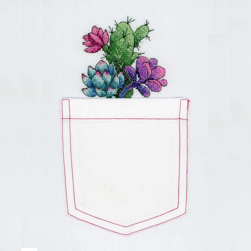 С недавних пор растительная тема получает всё большее распространение: кактусы, суккуленты и любые другие комнатные растения без цветков необычайно популярны в интернете, интерьере, моде… и вышивке. Эти неприхотливые растения находят самое разное воплощение, техникой вышивания нередко является гладь. Вышивкой кактусов и суккулентов украшают не только стены, но и подушки, сумки, одежду и другие вещи. Очень интересно смотрятся “колючие” изображения на кармашках рубашек и на черной основе.