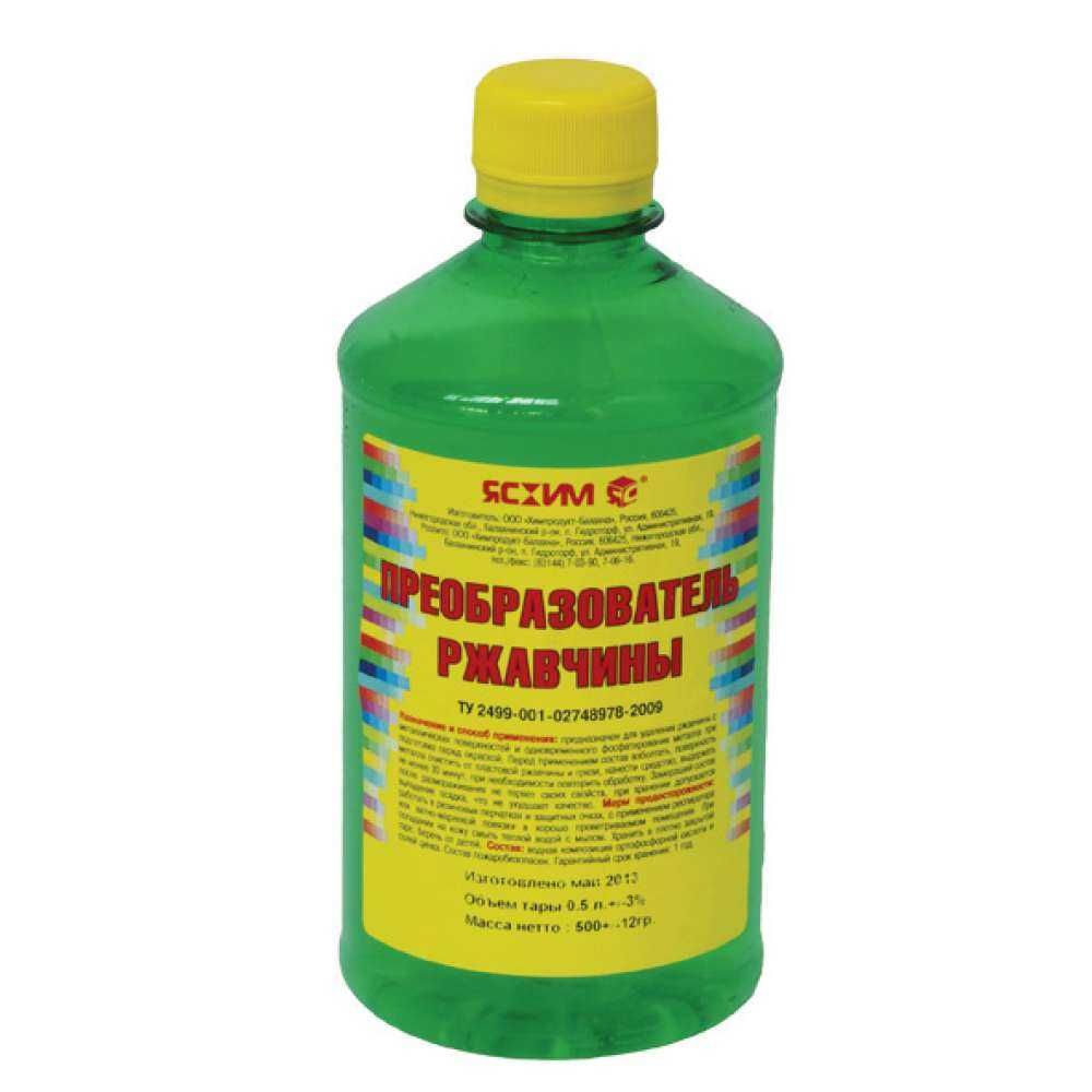 Преобразователь ржавчины в грунт. Этот состав, кроме преобразования агрессивных железных оксидов в неактивные элементы, создает на изделии грунтовочный слой, подходящий для нанесения на него лакокрасочных покрытий. Модификаторы коррозии в грунт выпускаются в двух флаконах: с раствором фосфорной кислоты и с раствором солей. Оба этих состава соединяются перед использованием, готовая смесь теряет активность после пяти дней.