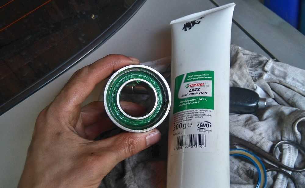 При обслуживании подшипник нужно тщательно очистить от загрязнений и прежнего смазочного материала, а затем обезжирить (для этого деталь можно несколько раз прополоскать в емкости с чистым бензином). Старая смазка содержит частички металла и имеет плотную консистенцию, поэтому увеличивает износ подшипника и может спровоцировать блокировку колес.