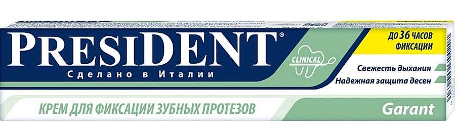 В составе PresiDent (Бетафарм, Италия) — вазелин и ароматизаторы. При его употреблении между десной и протезом не остается места для проникновения частичек пищи. Действие средства ослабляется при приеме горячих блюд и напитков.