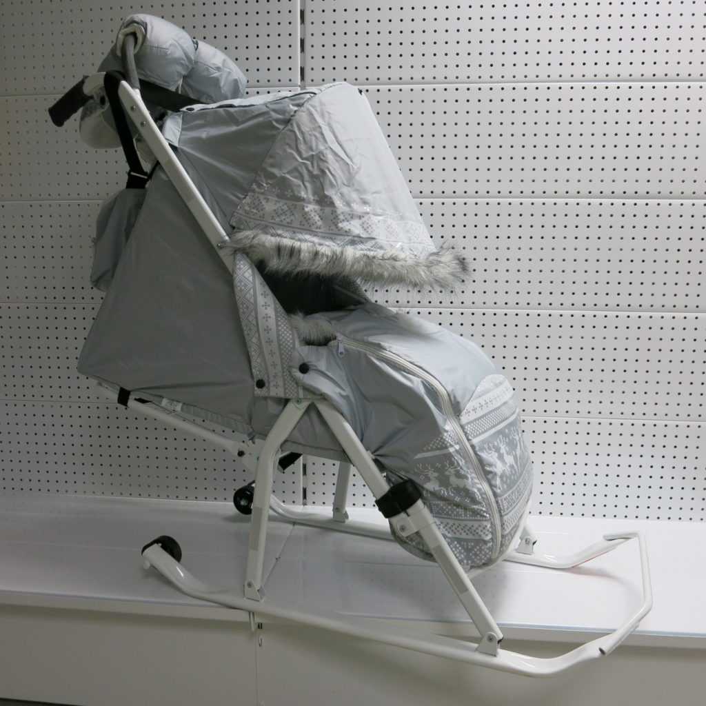 - Стандартный тип. Устройство имеет мягкое сиденье, имеющее удобную спинку, ручка складывается. Также товар оборудован специальными подлокотниками, ремнями безопасности. Эти модели подходят для коротких прогулок, при безветренной солнечной зимней погоде.