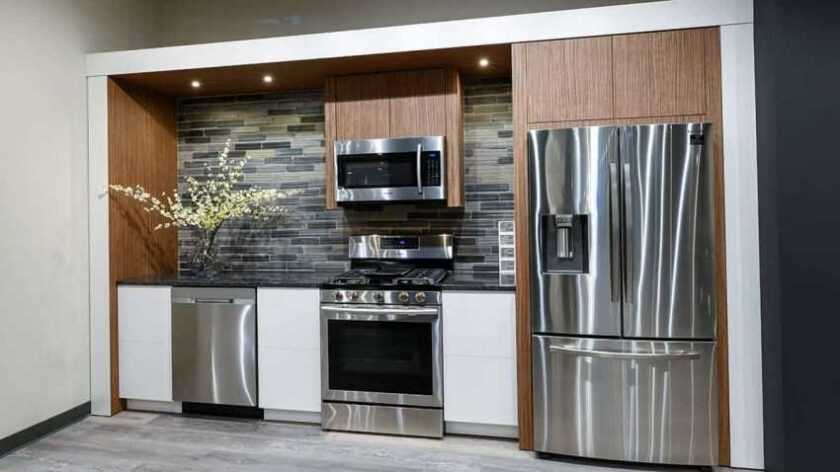 - Холодильник нужно ставить так, чтобы он стоял в конце кухонного гарнитура, при этом визуально высота комнаты увеличится.