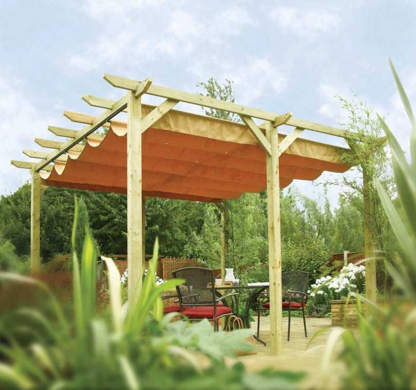 Навес, изготовленный из дерева, будет выглядеть благородно и красиво, если украсить полузакрытую постройку готовой резьбой, фигурными колоннами или укрепить на изделии ажурную решетку. Строение плохо переносит влажность и биологическое воздействие, дерево пожароопасно.