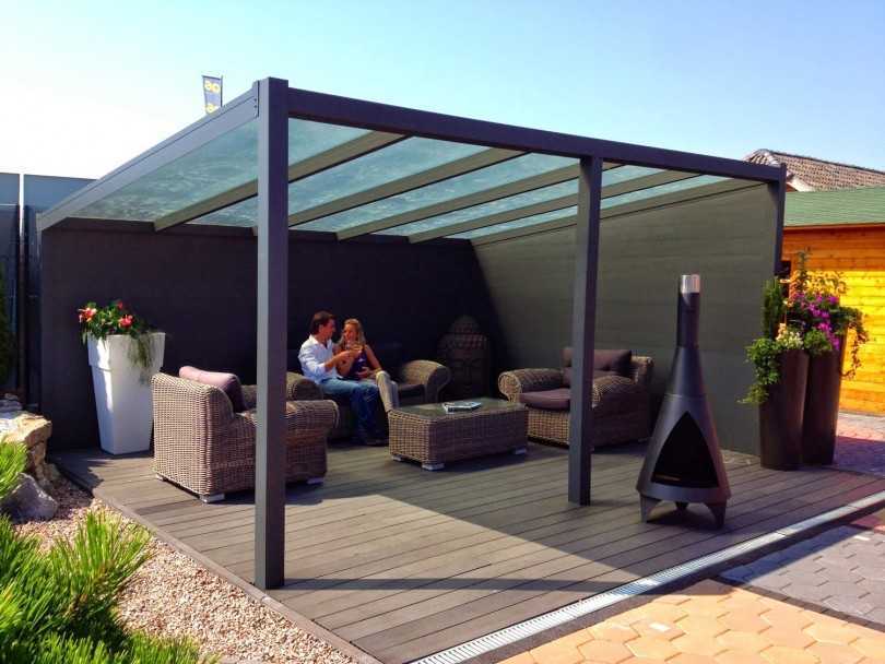 Вся конструкция укрывается кровлей. Каркасное сооружение обустраивается по бокам парапетом. Закрыть проемы от солнечной или ненастной погоды можно с помощью плотных водостойких штор, декоративной решетки или за счет мягкого остекления.