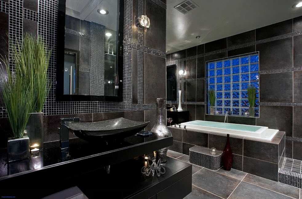 Классической считается монохромная комбинация чёрного и белого. Сочетание этих цветов всегда выглядит стильно, в него хорошо вписывается хромированная сантехника.