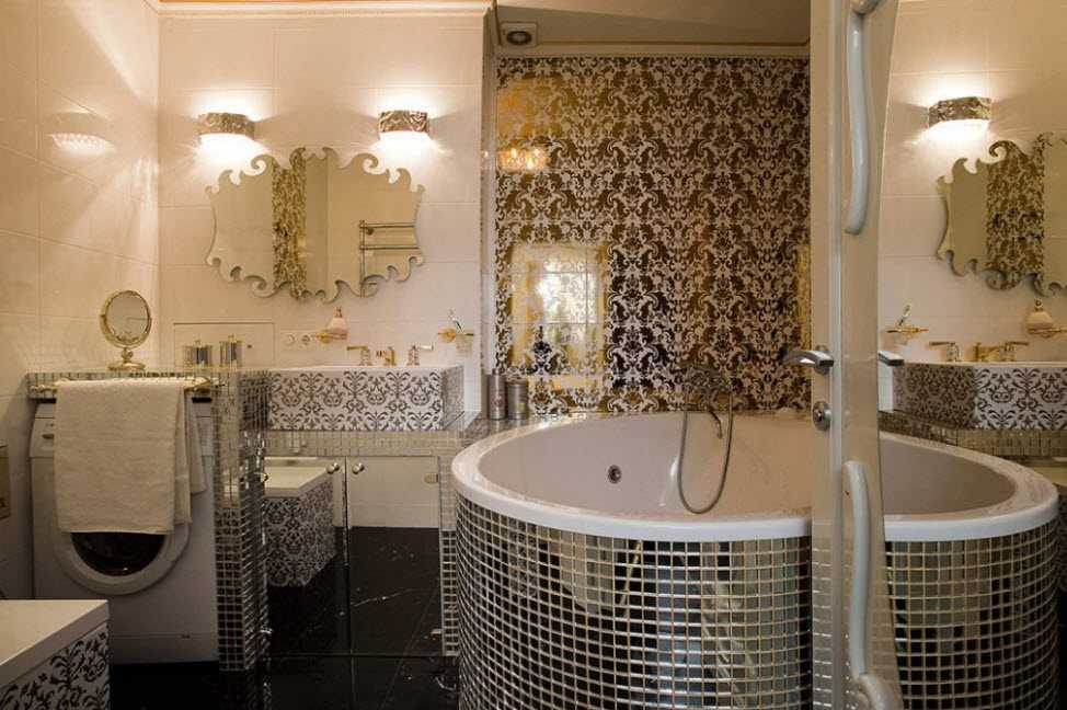 Если ванная комната маленькая, то с помощью зеркальных вставок можно создать иллюзию глубины пространства. Для этого достаточно уложить их по диагонали на полу и стенах. Еще один способ, позволяющий визуально «приподнять» потолки – выложить зеркальную плитку на потолке.