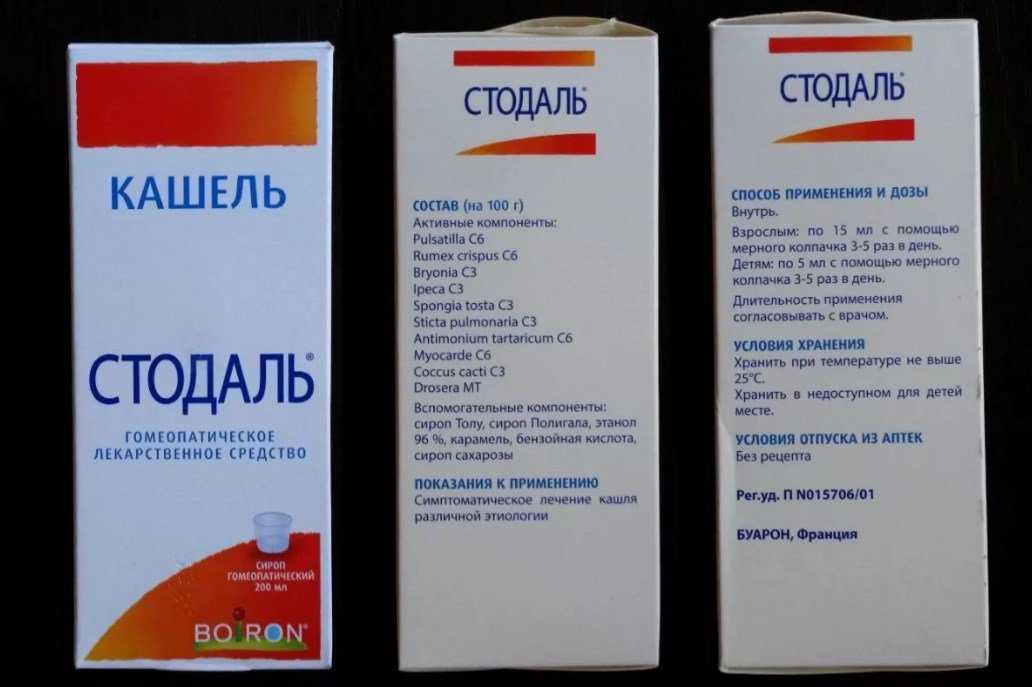 Стодаль – гомеопатический препарат французского производства. Лечит кашель любой природы. Средство многокомпонентное, поэтому перед приемом следует изучить полный состав и инструкцию. Выпускается в форме сиропа светлых оттенков, от желтоватого, до коричневого. Вкус и запах имеет своеобразный – бальзам Толу. Обладает муколитическим отхаркивающим действием. Способен увлажнять сухой кашель, успокоить сильный, облегчает симптоматику. Используется при продуктивном и непродуктивном кашле, как у взрослых, так и детей.