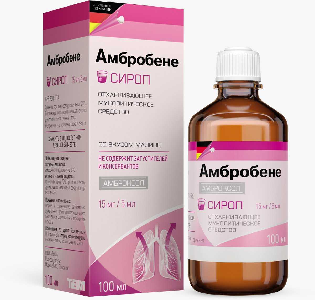 Амбробене – комбинированный препарат, название активного вещества совпадает с международным названием лекарства – амброксол. Относится к муколитикам, оказывает отхаркивающее воздействие. После приема начинает действовать через полчаса и результат длится до 12 часов. Полностью выводится из организма через выделительную систему. Одновременно с приемом Амбробене человеку следует пить много жидкости. Производство – Германия.