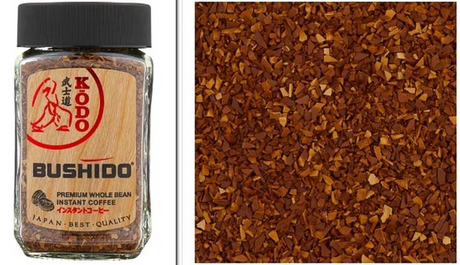 - Bushido. Изготавливается в Швейцарии. У продукта несколько оригинальных упаковок и особенных форматов выпуска. Есть продукт, который в составе имеет золото. Изготавливается из зерен арабики. Гранулы имеют темный оттенок, отличаются крупным размером. При заваривании приобретает выраженный приятный запах, в привкусе есть горчинка. Растворимость средняя, осадка нет.
