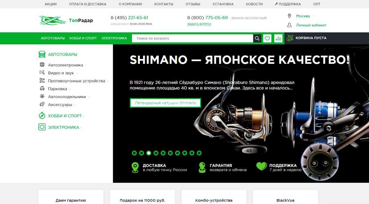 Онлайн магазин Topradar гарантирует возврат или замену товаров ненадлежащего качества для жителей всех регионов. На ряд товаров действует беспроцентная рассрочка и скидки на следующий сезон. Ценовая политика продавца не уступает конкурентам. Рыболовный интернет магазин Topradar имеет высокий рейтинг доверия посетителей и занимает 6 сточку в списке.