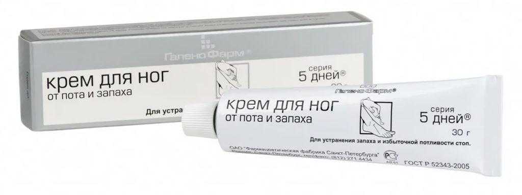 Популярное средство российского производства от гипергидроза, предназначающееся для ног. Серия «5D пять дней» включает кремы разного действия, лосьон, пасту, пудру, скрабы, ванночки. Каждый препарат соответствует нормам ГОСТ. Упаковка – алюминиевая туба 30 г с отвинчивающейся крышкой. Активным компонентом выступает окись цинка антисептического, противовоспалительного действия, что удаляет лишнюю влагу, подсушивает.