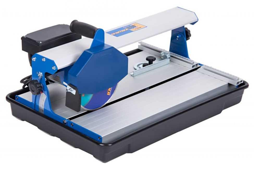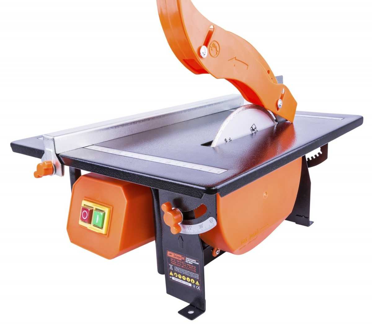 У этого плиткореза хорошо продумана система управления, все клавиши находятся в одном месте. Возможности устройства расширены за счет наклона стола до 45°. Мощность станка в 600 Вт, острый алмазный диск и скорость его вращения в 2950 оборотов в минуту ускоряют работу.
