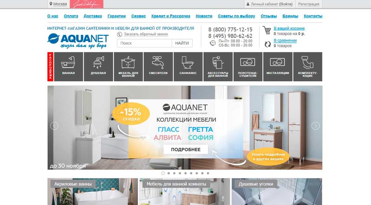 Товары, на которые действует скидка отмечены шильдиком – водяной полотенцесушитель с верхней полкой продается с дисконтом в 10%. Матовая ванная из искусственного камня с выгнутыми бортами стоит 93 000 руб. Она обработана особым бактерицидным составом, а теплоизолирующий материал сохранит необходимую температуру.
