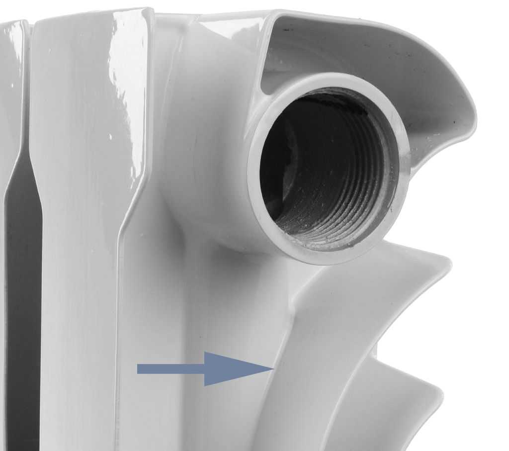 Сварочный шов, указывающий на изготовление методом экструзии. В литых радиаторах швы между коллекторами и ребрами отсутствуют.