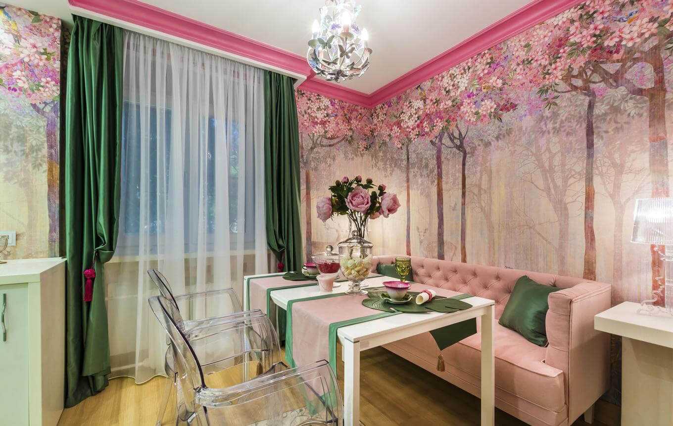 Обои к сиреневой кухне, какой бы они не имели цвет, должны успокаивать, так как цвет гарнитура будет основополагающим в вашем интерьере. Поэтому используйте материалы из светлой палитры. Обои к розовой кухне тоже должны быть нейтральными.