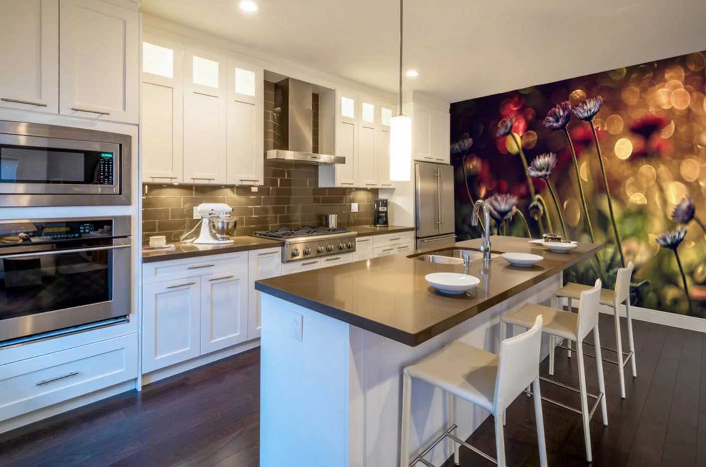 Очень необычная идея, заслуживающая внимания — обои с принтом… кухни! Качественный рисунок, визуально продолжающий помещение, смотрится здорово, а кухня кажется в два раза больше.