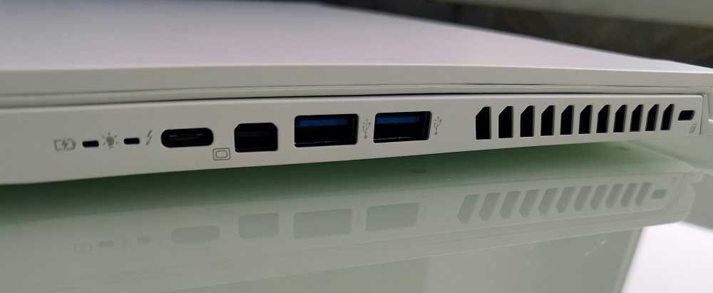 Справа мы находим два порта USB Type-A 3.1 Gen 1, мини-порт DisplayPort и единственный USB Type-C ноутбука, это USB 3.1 Gen2 и Thunderbolt 3. Здесь также есть пара индикаторов питания и подключенного оборудования.