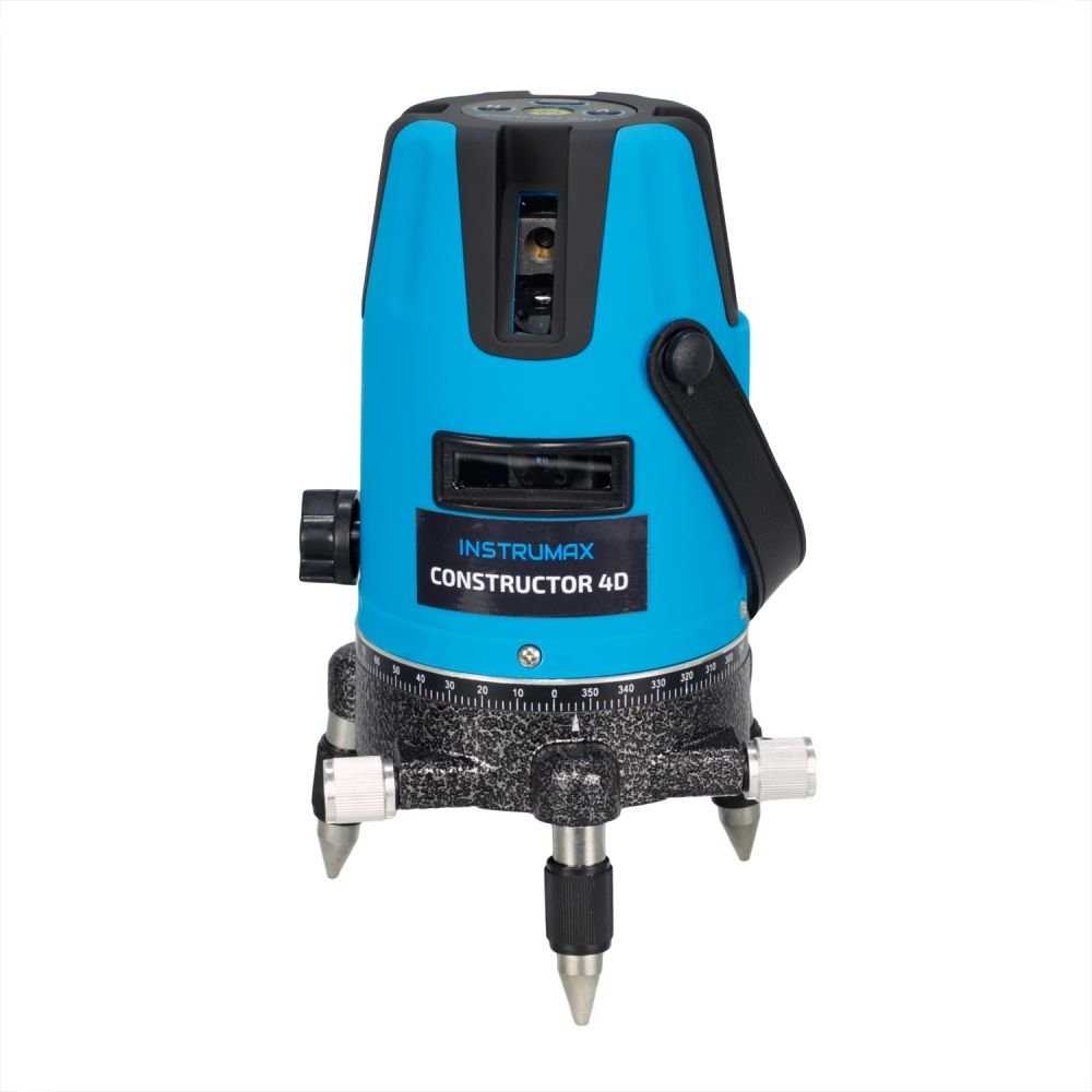Комбинированный лазер INSTRUMAX Constructor 4D в своем самом «расширенном» режиме работы строит в помещении три плоскости: одну горизонтальную и две вертикальных, пересекающихся под прямыми углами, а также перпендикуляр вниз. Есть возможность «отключить» ненужные полоски, и отобразить, например, только лазерный крест на одной стене. Конструкция прибора предусматривает возможность плавного поворота нивелира с шагом 2 градуса: на металлической подставке, к которой крепится нивелир, размечена шкала. Предусмотрена работа не только от батареек, но и от сети.