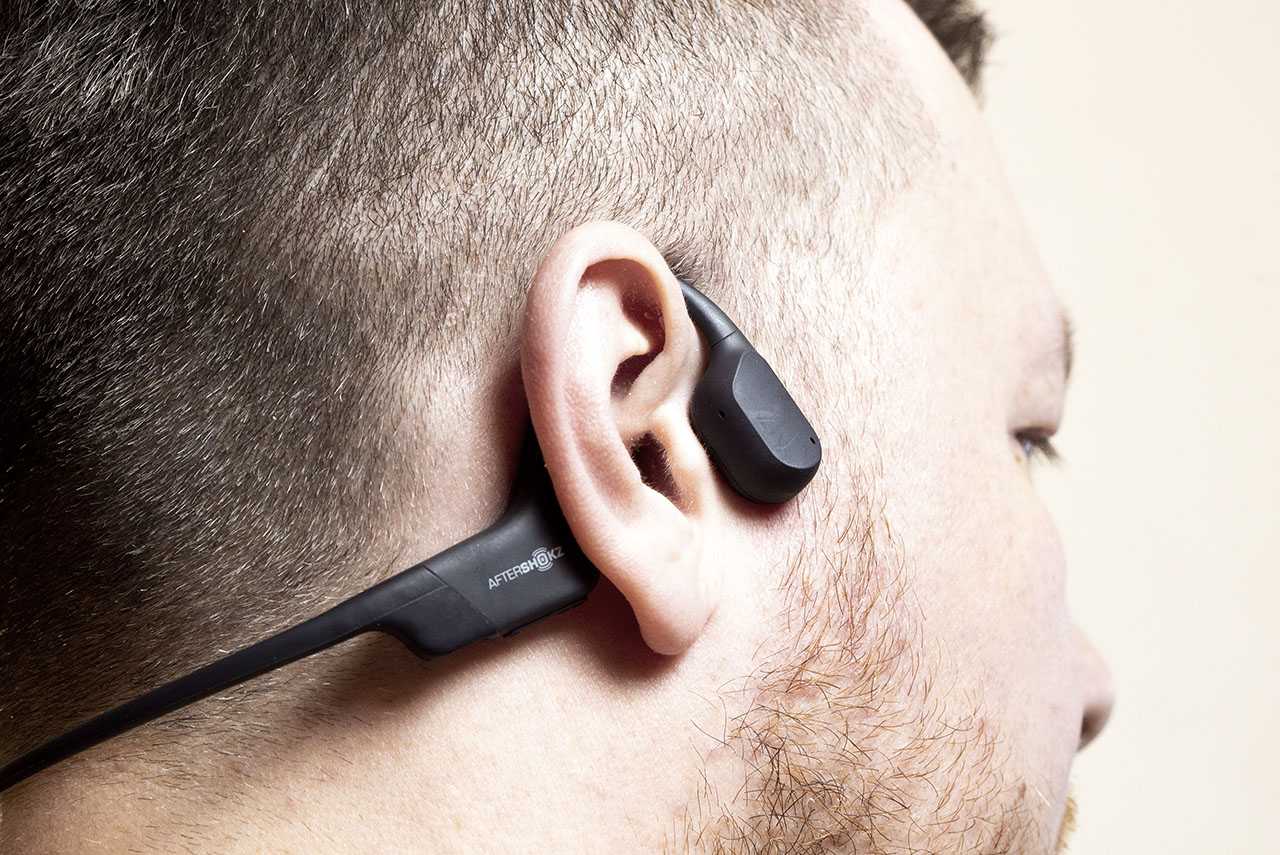 Aftershokz Aeropex представляют собой обруч, который нужно надеть на уши так, чтобы пьезоэлементы прижимались к вискам рядом с ушными раковинами.