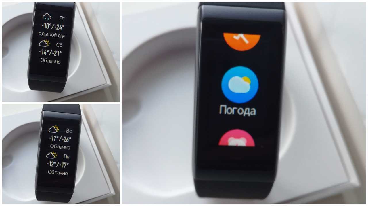 Умный браслет отображает погоду. Ее можно посмотреть через специальную опцию или добавить на главный экран вместе со временем. Как и с часами, есть возможность настроить дизайн и способ отображения погоды — картинками или словами (в английской версии рекомендуется использовать первый вариант, поскольку второй часто не помещается на экране).