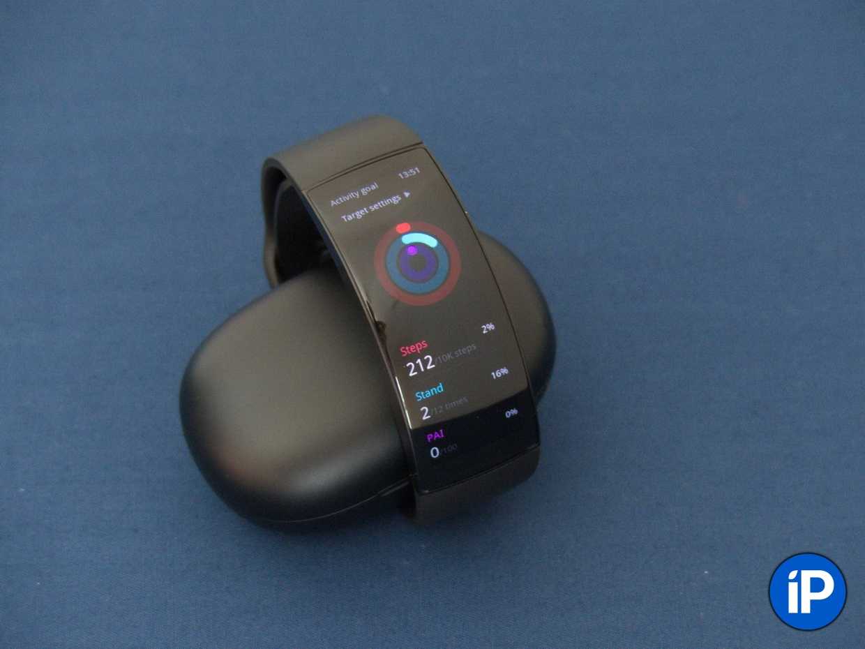Экран является большим для этого сегмента устройств; своим внушительным размером по диагонали он походит на смартфоны, но никаких неудобств от большего размера дисплея не ощущается — это устройство из-за позиционирования как фитнес-трекер изначально разрабатывалось, чтобы не приносить дискомфорта владельцу при активных движениях. Для этого сделан удобный резиновый ремешок, закруглены края экрана, чтобы он не зацеплял одежду при движении – в общем, больший размер никак отрицательно не чувствуется. С нашей стороны, единственным отрицательным моментов в сборке данного устройства можно считать оголенный разъем для подзарядки — он находится на внутренней части экрана и контактирует с кожей.