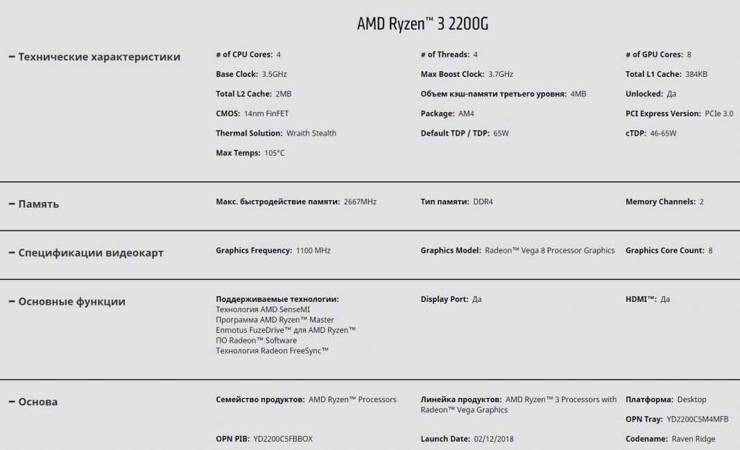 Технические характеристики Ryzen 3 2200G