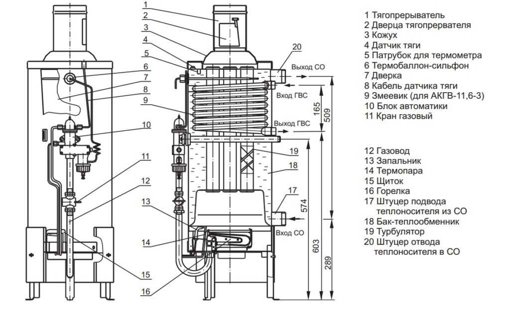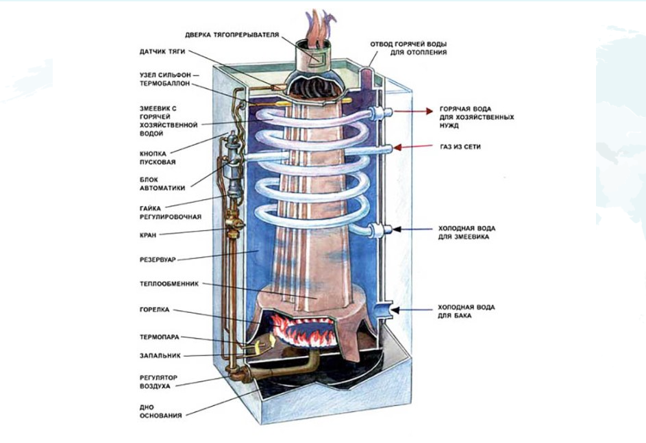 Внизу котла, непосредственно под баком с теплообменником, находится газовая горелка, с помощью которой происходит нагревание воды. При небольшой модернизации устройства возможна его эксплуатация на основе сжиженного газа.