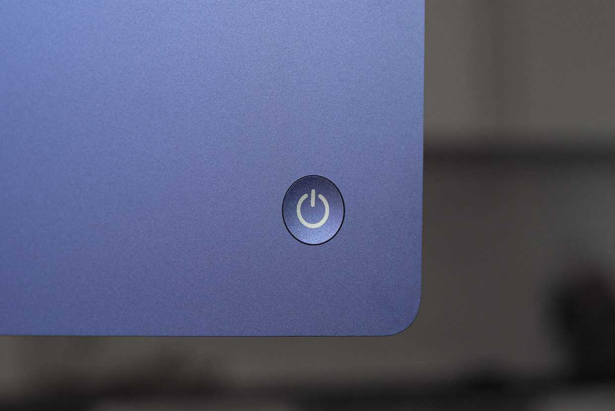 Сам экран со всех сторон окружен светло-серой лицевой панелью толщиной чуть менее 2 см, а также более толстой 6 см кромкой внизу, которая соответствует цвету iMac. Передняя часть дисплея представляет собой цельный кусок стекла, простирающегося до самого низа, и покрытого тем же антибликовым покрытием, что и монитор Apple Pro Display XDR
