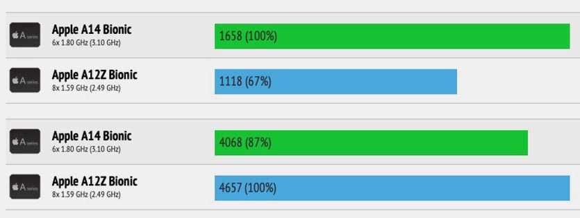 | Процессор | Apple A14 Bionic, шестиядерный процессор 2,5 ГГц | Apple A12z Bionic, шестиядерный процессор 2,5 ГГц |