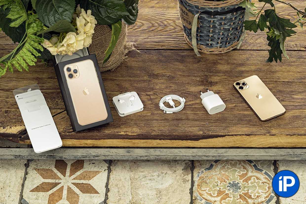 В комплекте iPhone 11 Pro: наушники EarPods с разъёмом Lightning, зарядное устройство 18 Ватт с USB-C и кабель USB-C на Lightning.