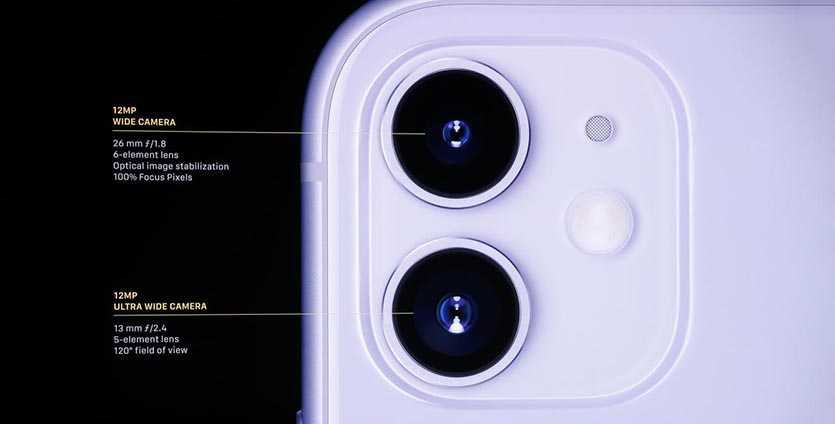 iPhone 11: основная камера у смартфона сдвоенная. 12-мегапиксельный модуль имеет диафрагму ƒ/1.8, второй сверхширокоугольный – ƒ/2.4. Камера поддерживает ночной режим и автокоррекцию, как у флагманов линейки.