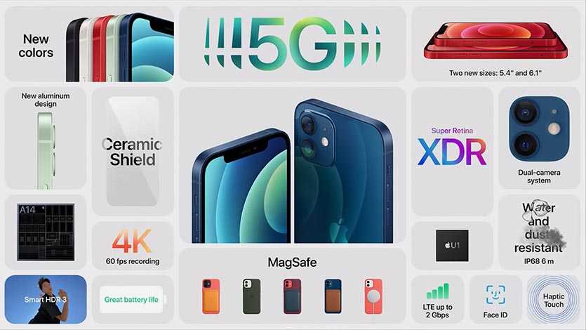 iPhone 12 поддерживает работу в сетях пятого поколения, может работать с магнитными беспроводными зарядками MagSafe и соответствующими аксессуарами, оснащается модулем Wi‑Fi 6.