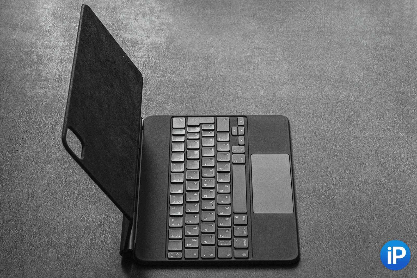 Внешне iPad Pro в раскрытой Magic Keyboard смотрится шикарно, будто он зависает в воздухе. Во время работы крышку чехла не видно, она оптически скрывается за рамками планшета.