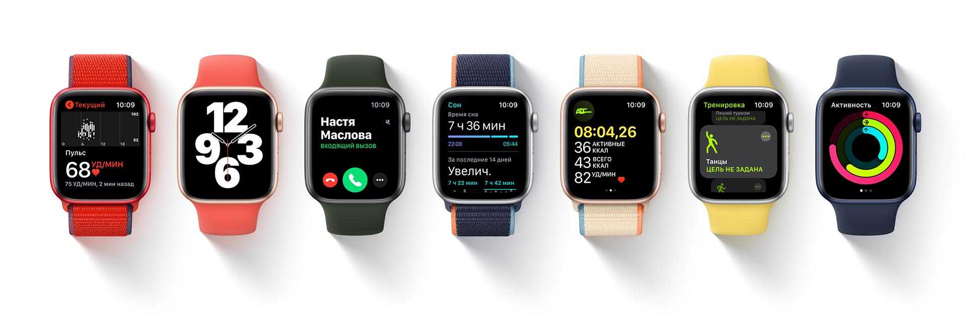 В модельном ряду умных часов Apple 2020 года также имеется и флагманское устройство – Apple Watch Series 6. Их стоимость начинается с 36 990 рублей. Apple Watch Series 6 обладают рядом расширенных функций, таких, как постоянно включенный дисплей, более быстрый чип S6, а также возможность снимать ЭКГ (в России пока недоступно) и контролировать уровень кислорода в крови.