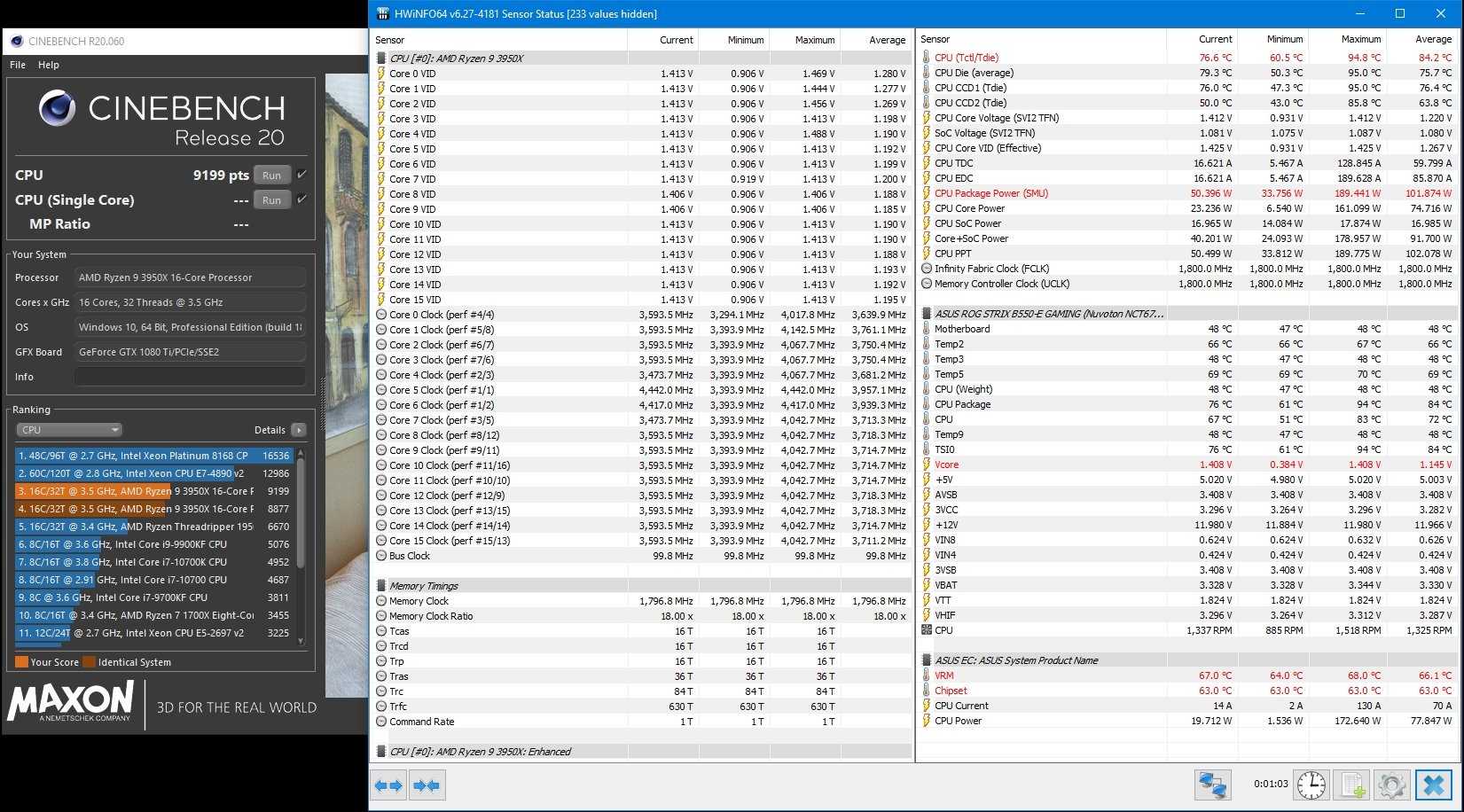 Теперь посмотрим, как поведет себя материнская плата ROG Strix B550-E Gaming, если в настройках BIOS переключить PBO в положение «Enabled». Первое, что бросается в глаза — это существенно возросшее до 190 Вт энергопотребление 16-ядерного Ryzen 9 3950X. Однако форсирование технологии PBO позволяет материнской плате удерживать частоты ядер процессора на уровне 3800-3850 МГц при рендеринге.