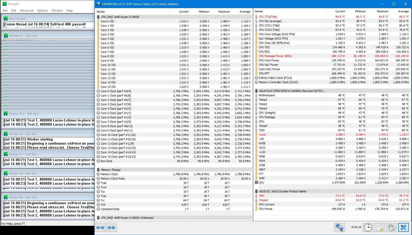 Стресс-тест Prime95 FPU понижает рабочие частоты ядер процессора на плате ROG Strix B550-E Gaming до 3200 МГц. При этом энергопотребление Ryzen 9 3950X при долговременной нагрузке стремится к 115 Вт.