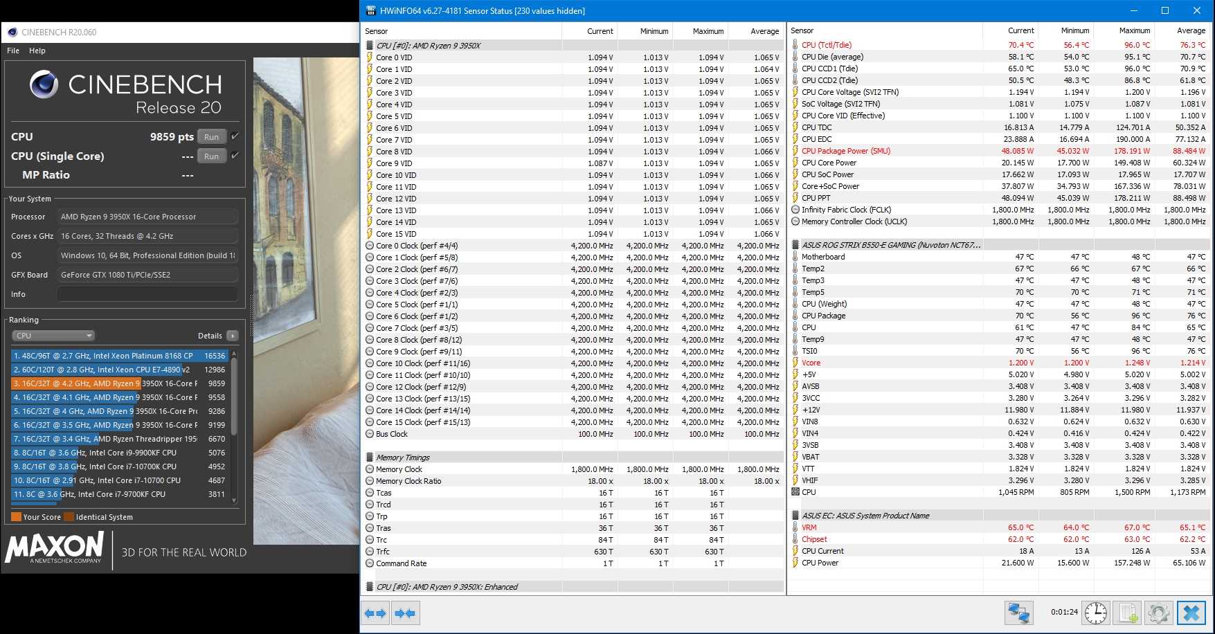 Наиболее интересный вариант на ROG Strix B550-E Gaming получается с ручным разгоном процессора. Частоту всех ядер Ryzen 9 3950X на этой плате нам удается зафиксировать на значениях 4200 МГц без потери стабильности. При этом мы получаем не только максимальную температуру процессора, но и существенно возросшую производительность в Cinebench R20.