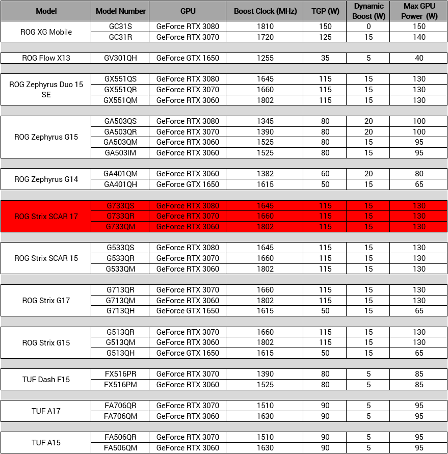 В ноутбуках Strix SCAR 17 выпущенных в 2021 году, устанавливается одна из трёх видеокарт NVIDIA: GeForce RTX 3060, RTX 3070 или RTX 3080. Друг от друга видеокарты отличаются количеством CUDA-ядер, тактовыми частотами, объёмом памяти и конечно же производительностью.