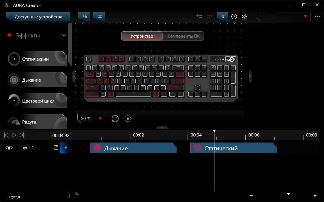 Настройка подсветки максимально тонкая. Можно выбрать свой цвет для каждой клавиши, создать группы, комбинации и записать это в последовательность. Доступны предустановленные эффекты вроде дыхания, пульсации, радуги и т.п.