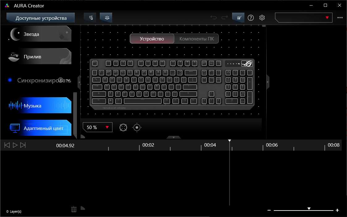 Настройка яркости и световые эффекты можно регулировать в режиме «онлайн»с помощью фирменного ПО ASUS Armory и в «оффлайн» режимес помощью особых комбинаций клавиш. Можно переключать одиннадцать стандартных световых эффектов с четырьмя уровнями регулировки скорости. Если же вам необходимо расширить функционал подсветки, выделить особые клавиши, добавить макросы и привязать их к клавишам, то без фирменного программного обеспечения тут никак не обойтись.