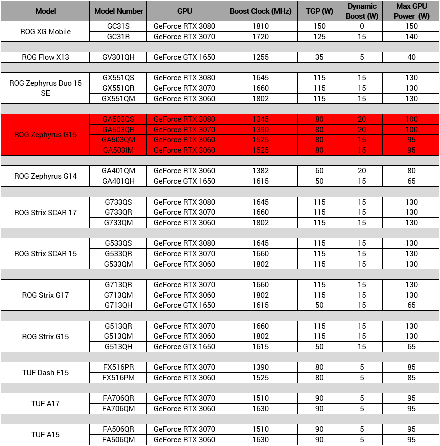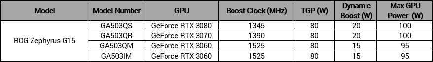 Вернёмся к ноутбуку Zephyrus GA503. Как уже было сказано, его дискретная графика зависит от модификации. Модельный ряд Zephyrus G15 широк, ноутбук может оснащаться видеокартами GeForce RTX 3060, 3070 и 3080. Базовое значение TGP для всех видеокарт составляет 80 Вт, и может увеличиваться на 20 Вт для RTX 3080 и 3070, и на 15 Вт для RTX 3060. Базовые тактовые частоты указаны в таблице ниже.