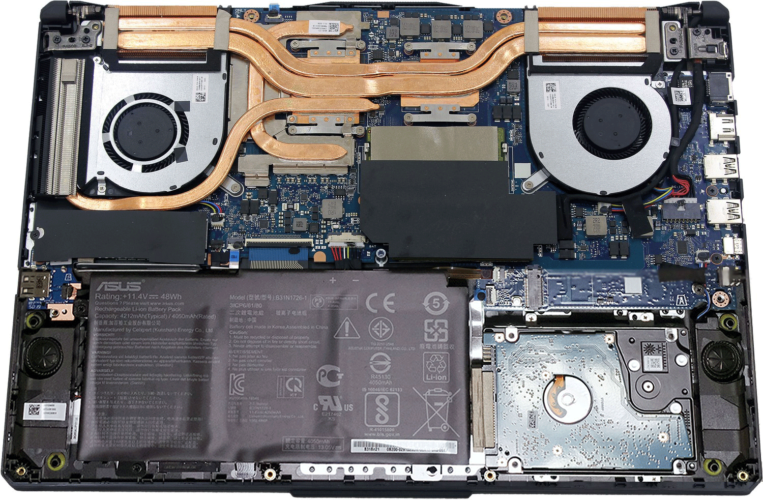 Среди других характеристик можно отметить до 32 Гбайт оперативной памяти с частотой 3200 МГц, до двух твердотельных накопителей NVMe объемом по 1 Тбайт каждый, поддержку стандарта беспроводной связи Wi-Fi 6 (802.11ax) и увеличенную до 90 Вт·ч ёмкость батареи. Впрочем, здесь стоит оговориться: имеется и вариант на 48 Вт·ч с посадочным местом под HDD. А у версии с более емкой батареей дополнительное пространство отдано аккумулятору и остаются только два SSD. У модели прошлого поколения FX505 была единственная версия — с аккумулятором на 48 Вт·ч и возможностью установки HDD.